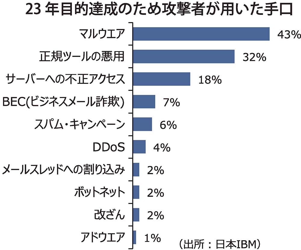 IBMコンサルティングのセキュリティー・サービス部門のIBM X-Forceによると、2023年は「ハッキングと比べて、サイバー犯罪者が正規アカウントを通じて企業ネットワークに侵入するログインの機会が増加し、この戦術が、脅威アクターが優先的に選択する武器となっている」と分析している。